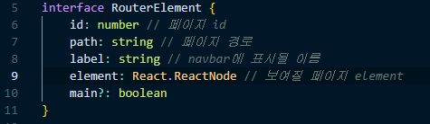 createBrowserRouter()는 라우터를 객체로 관리한다. 다음과 같이 관리할 라우터 객체의 타입을 선언해주었다. 장바구니 프로젝트에는 Navbar가 모든 페이지에 포함되기 때문에 Navbar 컴포넌트가 포함된 페이지를 메인 레이아웃으로 두기로 한다. 메인 레이아웃 컴포넌트를 라우터 객체에서 관리할 수도 있겠지만, 그렇게 되면 다른 페이지들이 메인 레이아웃 컴포넌트의 children 프로퍼티에 들어가야 해서 재사용하기 어려울 것 같았다. 그래서 createBrowerRouter() 를 사용해 가공된 라우터 객체 배열을 전달하기로 했다. 현재는 모든 페이지에 Navbar가 들어가지만, 이후 Navbar가 없는 페이지가 생길 경우의 확장성을 고려해 main 프로퍼티를 optional하게 지정하여 작..